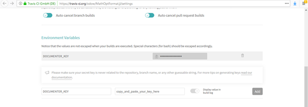 To reiterate: make sure that the "Display value in build log" option is OFF for the variable, so that it does not get printed when the tests run. This base64-encoded string contains the unencrypted private key that gives full write access to your repository, so it must be kept safe. Also, make sure that you never expose this variable in your tests, nor merge any code that does. You can read more about Travis environment variables in Travis User Documentation.